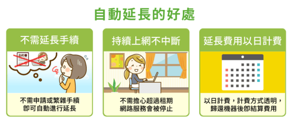 若超過預計歸還日,訂單即會自動進行延長,無需繁雜手續,即使行程臨時變更,也可繼續使用WiFi上網服務。自動延長後,則視機器歸還日期為歸還日進行計算。