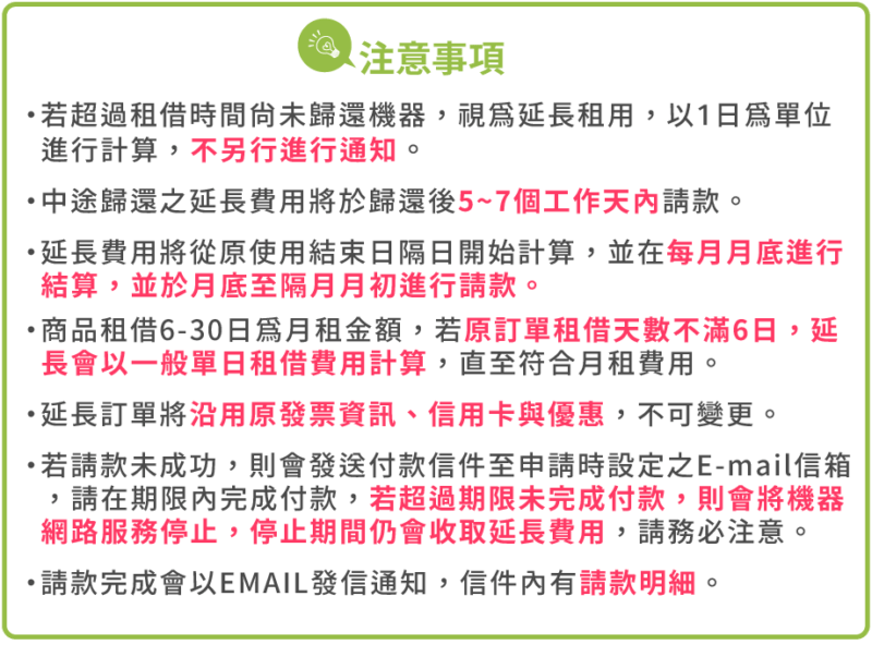 ※若於月底前歸還機器,機器則會於歸還後5個工作天內進行請款。