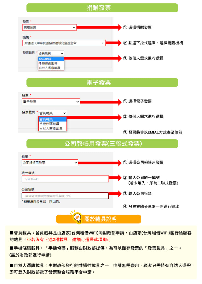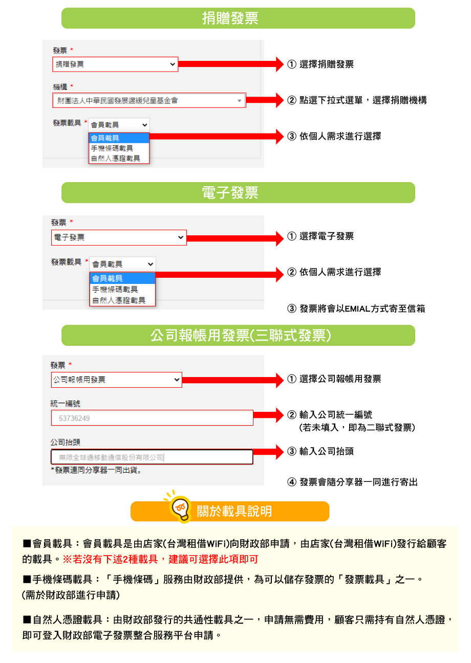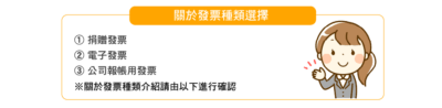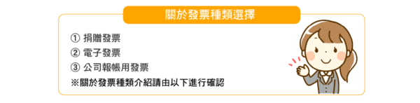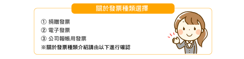 選擇發票時提供三種方式,分別為捐贈、電子發票、公司報帳用,請顧客可依以下介紹,選擇符合需求的方式。
